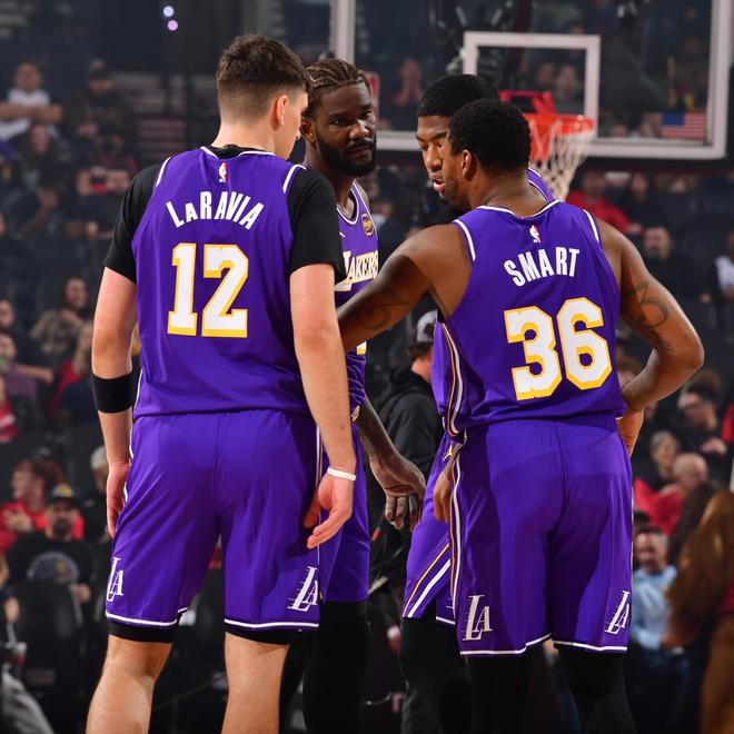 湖人队首发阵容:斯马特、拉拉维亚、克内克特、八村塁、艾顿