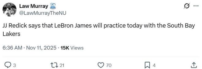 而在湖人队一口气配齐5大争冠帮手之际,詹姆斯伤病恢复也迎来突破,雷迪克亲承詹姆斯将和南湾湖人(湖人的G联盟下属球队)一起训练。