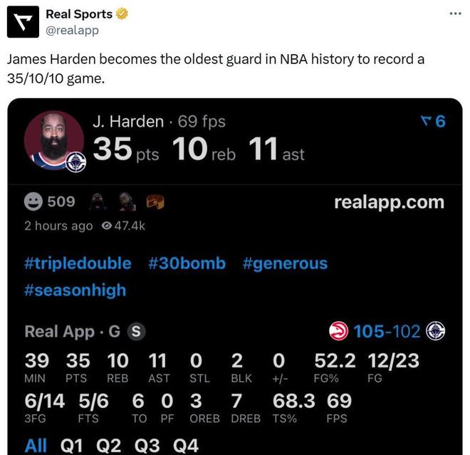 凭借这样的表现,36岁78天的哈登成为NBA历史上拿下35+10+10最老的后卫。