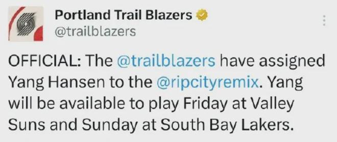 NBA开拓者官宣:杨瀚森被下放至发展联盟,将出战两场比赛