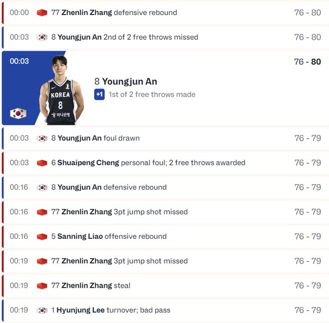 终场前19秒张镇麟抢断成功,随后出手绝平三分未能命中,廖三宁又拼下一个前场篮板传给张镇麟,终场前16秒张镇麟三分出手但未能命中,这两个绝平三分投丢后中国男篮已经无力回天,程帅澎的犯规预示着男篮逆转失败。