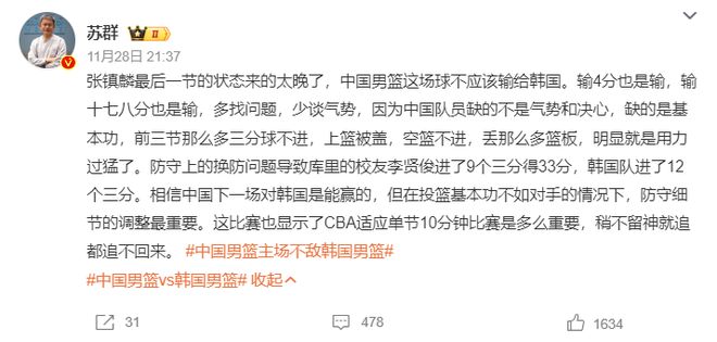 赛后苏群老师说张镇麟最后一节的状态来的太晚,中国男篮球员缺的不是气势和决心而是基本功,前三节各种空位三分不中,上篮被帽,空篮不进,各种丢篮板。